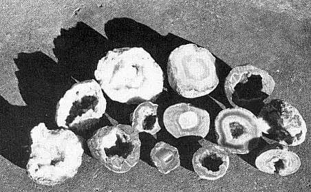 Perhaps the most unique of all stones is the geode. It is interesting because of the way it changes in layers from a rough outside to a pretty and hollow inside. Though geodes are the gemstones of Missouri, they don't look like much when picked up, for the outside looks like an ordinary rough, roundish rock. But inside it is hollow with little crystal formations, like miniature pieces of smokey or crystal quartz. The rocks are formed as a solid ball, and then through the ages the action of water precipitates out some of the material while the rest of it solidifies to make the characteristic shapes.