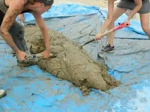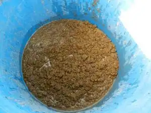 Add 4 parts dry sawdust to the mix, stirring as you go to ensure even consistency, and let soak for an hour. The sawdust should be fine, but not granular, and it should be almost fully submerged in water for the soak. If this is not the case, add more water and adjust the ratio for the next batch. All of the sawdust needs to soak with the lime, however too much water at this stage will require adding dry sawdust later, which weakens the consistency and integrity of the mix.