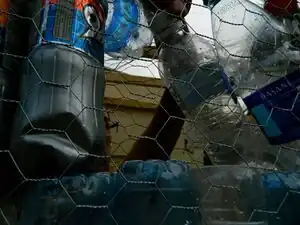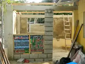 Ecoladrillo is made from clean plastic bottles and trash, wood, chicken wire, and plaster. The plastic bottles and trash make up the majority of the wall. Plastic bottles are stuffed with clean non-organic trash and are then stacked into a wooden frame with chicken wire stretched over each face to hold everything together. A plaster is then applied to each face.