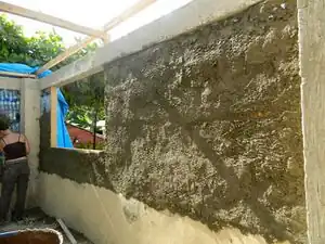 Apply the first layer using a trowel or by hand with gloves on. Throw the plaster at the ecoladrillo so that it fills in the gaps between the bottles and completely surrounds the chicken wire. This is a thin layer where bottles and chicken wire can still be exposed. The limited use of cement makes application difficult and somewhat of an art form. If the mix is too dry, the plaster will crumbled and bounce off the wall when you try to apply it. It needs to be wet enough to go through the chicken wire without breaking, but not so wet that it slides off the wall.