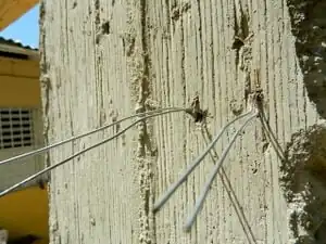 The main issue regarding the construction of ecoladrillo infill is the insufficient amount and placement of wire to tie and tighten the chicken wire flush to the wall. Wire ties are secured to the rebar within the columns and beams at 20 cm increments, however none are placed at the corners where columns and beams or columns and floor met. In some places wire is nailed into the corner, offering a less secure but passable solution, but in others the only solution was to tie the interior chicken wire to the exterior to lock in the bottles and to keep the chicken wire from flaring out. However, this solution results in the chicken wire being less taught and creates a gap between the chicken wire and the corner which ultimately has to be filled in with mortar. The more taught and secure the chicken wire, the less severe the walls can potentially bow out. The more flush the chicken wire is with the columns and beams, the easier it is to apply the plaster and the less likely it is that the plaster will crack. The lesson learned is to overestimate the quantity of wire needed and to never neglect the corners.
