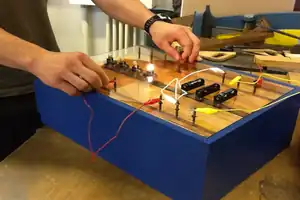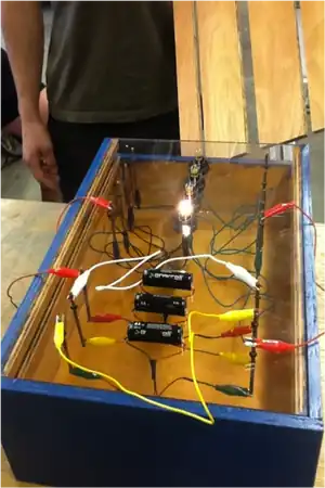 The finished product is a wooden box (18"x13"x6") that is placed on a table and interacted with by students. The top of the box is comprised of a pane of transparent polycarbonate with holes drilled through it to accommodate 4 light bulbs, 3 batteries, and 14 conductive terminals; one positive terminal and one negative terminal for each light bulb and battery. Beneath the polycarbonate is a "slider" which prevents the student from viewing the wiring inside of the box. The slider has channels that allow the conductive terminals and the leads on the batteries and light bulbs to sit beneath the slider and therefore be out of view when the slider is in place. This allows the light bulbs and batteries to be wired to terminals in a way that is mysterious and puzzling to students. The slider can then be removed to create a surprising reveal, allowing students to see how the components are actually wired.