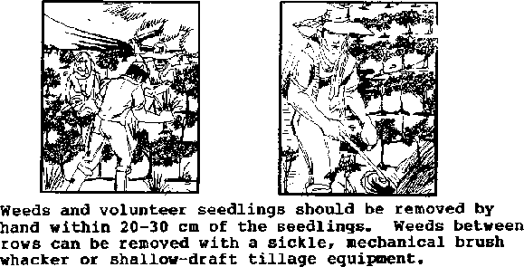 Weeds are a major cause of failure and irregular field establishment of leucaena. Weed control is essential for reliable results. Regular hand weeding or cultivation between rows combined with hand hoeing within rows until plants are 1-2 m tall will give best results (Figure 6-1). On large plantations, or in areas where labor is expensive, the use of herbicides may be an attractive option.