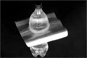 The Solar Bottle Bulb is made out of recycled 1.5 liter plastic bottles that are filled with water and a small amount of bleach. The bleach in the water prevents the bottle from becoming green with algae and keeps the water clear for longer periods of time.[5] The bottle is inserted through a steel sheet that serves as a lock to keep it from slipping or becoming loose. It is then attached to an iron roof so that a small portion of the bottle is left outside and the rest is inside of the house. A silicone-based or polyurethane sealant is used to make sure the small opening in the roof is weather-resistant. The light from the sun refracts through the bottle and gives off the same amount of light as a 40-60 Watt incandescent bulb. The bulb's brightness is entirely dependent on the amount of sunlight available.