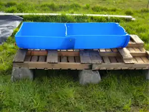 The barrel is then placed in the trough. The end of the barrel opposite the spigot is elevated by placing a 2"x4" across the trough.