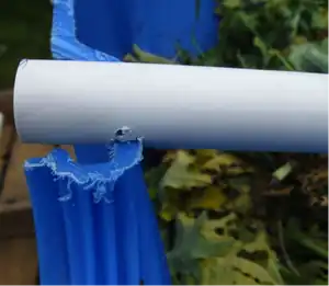 The connection of the barrel is supported by placing a small cut of 4"x4" lumber inside the trough. The rain cover is constructed with ½" PVC piping. For this barrel, four 2'7" lengths, two 7¼" lengths, two ½" T-joints, and one ½" 90° elbow are used. Two of the 2'7" sections are joined by a T-joint, to make a total of two 5'2" crossbars that will span the length of the barrel.