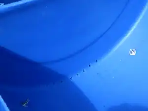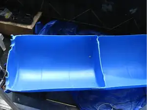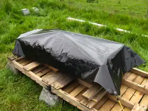 The 10 mil plastic sheet is laid over the top and cut, with an overhang of at least 6" on each side. Grommets are installed at each corner of the sheet, folding over the corners for extra strength. The worms are then added to the bin, along with compostable waste and the bedding material (horse manure or shredded paper).