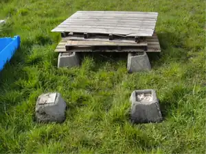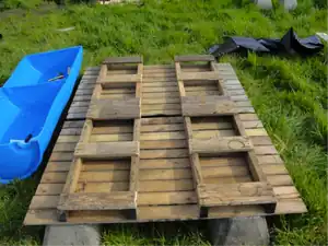 After the caulk has set, the base is created. Six cinder blocks are placed underneath the corners of the pallets.