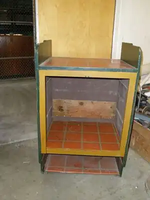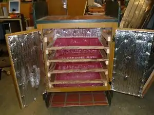 The drying cabinet, shown in Figure 3, the Sodhoppers used was actually a recycled cupboard. Any sort of box would have been a good candidate for the body of the dryer. The doors were removed and insulation was stapled to the inside of the cabinet, shown in Figure 3a. Next the shelving was put in. It consisted of 4 blocks of wood standing at each corner and smaller pieces of wood branching off of them to form a shelf that the drying racks could easily sit on, shown in Figure 3b. The Drying box with racks inside is shown in Figure 3j. Then the doors were put back on with new hinges and a latch to secure the doors, shown in Figure 3k.