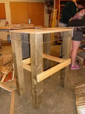 - Screw plywood onto the four 4 x 4 pieces so that the base can stand freely. Next screw the pieces of acrylic glass onto the sides of the base so that the cabinet will be safely fastened into the base. Make sure two or three inches of acrylic glass are above the base of the plywood.