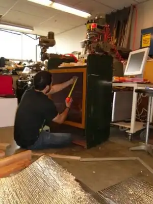 - Staple insulation inside the cabinet covering every surface area. Make sure to cut out holes to fit the holes already drilled into the cabinet.