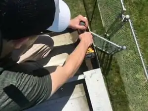 Using 2.25 inch hole saw, drill hole in bucket lid, attach bulkhead fitting.