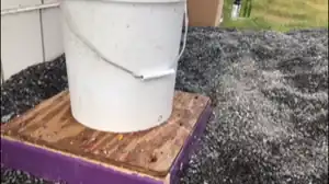Install the first flush: attach a 90 degree connector to conveyance pipe so that the pipe turns toward the storage tank. Connect 2 feet of pipe to the 90 degree connector. Connect a T branch connector to that and attach another 2 feet (or appropriate length) of pipe on the other side to connect to the catchment tank. From the bottom of the T branch, connect a short length of 2" PVC, attach a 2"-->3" adapter followed by 3 feet of 3" PVC. Place a ball that will float inside the 3 inch PVC and connect a 2"-->3" adapter to a short length of 2 inch PVC. Connect this length to bulkhead fitting in bucket lid.