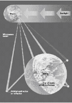 Solar power could be collected on the moon. Many different beams of 12cm wavelength microwaves would deliver power to receivers at sites located worldwide.[1] Each receiver would supply commercial power to a given region. Such a receiver, called a rectenna, would consist of a large field of small rectifying antennas. A beam with a maximum intensity of less than 20% of noontime sunlight would deliver about 200 W to its local electric grid for every square meter of rectenna area.