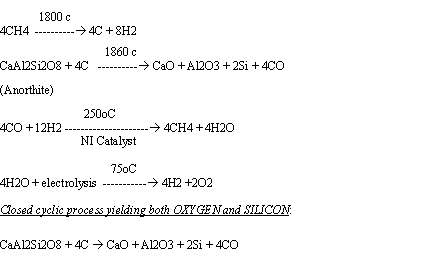 The silicon film is a proprietary process, and only a very general process is designed.[3] The generic process consists of ceramic formation, metallurgical barrier formation, polycrystalline layer deposition, emitter diffusion and contact fabrication. The conductive ceramic substrate is fabricated from selected low-cost materials. The metallurgical barrier prevents the substrate impurities from entering and contaminating the active thin silicon layer. The randomly textured and highly reflecting metallurgical barrier improves light trapping. A suitable p- type doped 30 - 100micro-cm active layer is deposited from a liquid solution. Phosphorus and aluminum impurity gathering are used for bulk quality improvement. Cells with large areas of 240, 300 and 700 cm2 are developed. A cell with an area of 675 cm2 has demonstrated the record efficiency of 11.6 - 17.7%.[4]The waste products present in the lunar surface are silicon, iron, TiO2, etc. These products can be used as raw materials for solar cell fabrication. A special compound called anorthite is used for extracting the above said components. Carbothermal reduction of anorthite,