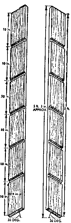 First mark off the bottom of one stringer at an angle of 30 degrees on the width and some 6 degrees on the thickness and cut off the waste. At intervals of 10 inches draw guide lines parallel with, and measured from, the bottom. These guide lines indicate the center line of treads; the marking off for the saw cuts should therefore be 7/16 inch on either . side of these lines. Now mark off a total length of 5 feet and saw off the waste, making the cut parallel with the bottom. Note that no saw cuts for the tread grooves have yet been made. Cut and mark off the second stringer similarly, remembering that the guide lines will face each other when the stringers have been cut as shown in Fig. 1. Measurements must again be made from the bottom so that the stringers will correspond.