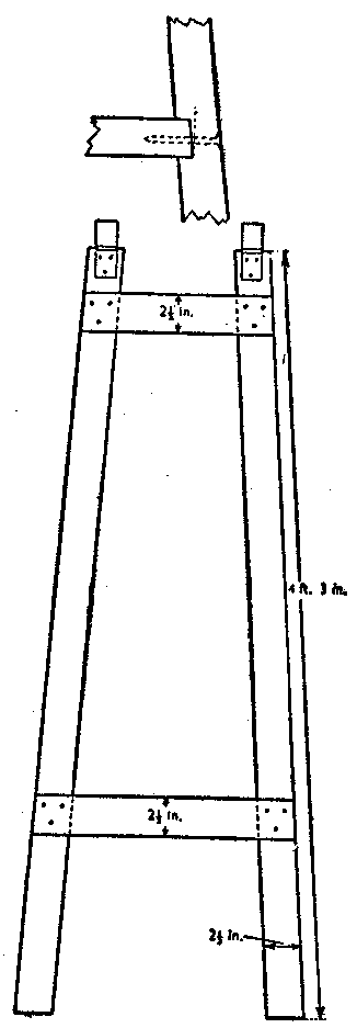 Next, cut the legs in the following manner. Take the front section and lay it face downward. Place one of the legs so that one end butts on the bottom edge of the back piece and the outside edge lies flush with the outside face of one of the stringers. Mark the top end of the leg and cut it at an angle so that it will butt flush against the bottom edge of the back piece. Mark off 4 feet 8 inches and make another cut parallel to the cut at the top end of the leg. The other leg is dealt with similarly. It will be noted that the bottom ends of the legs are not at right angles to the edges of the legs. Place the legs in position again on the front section. Mark off the bottom brace by placing a length 12 inches from the foot of the legs. The top brace is marked off 8 inches from the top of the legs. The braces can now be screwed on to the legs.
