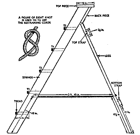 All that remains to be done is the fitting of the restraining cords. Drill a 3/8 inch hole in each stringer 18 inches from the foot and one in each leg 17 ½ from the bottom.