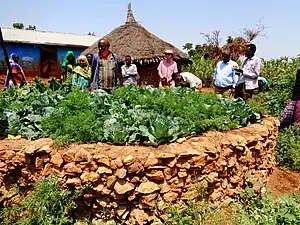 It is meant to be a domestic garden able to feed a family all year. It can also be scaled up in order to feed more people. It is usually a circle shape on a flat area.