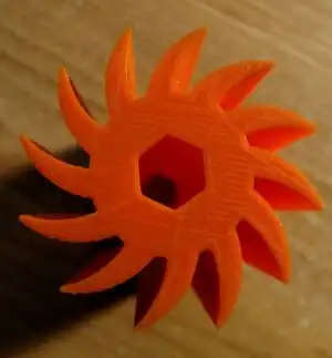 This is a cross-flow turbine,[1] basically a water wheel turned by stream to produce energy. This provides energy without the cost of fossil fuels; while the only time and energy used to work on it is occasional maintenance and set up. This would used in developing areas around the world because it is much cheaper and less time consuming to make. The material cost of this turbine itself is significantly reduced using 3D-printing.