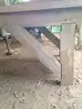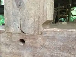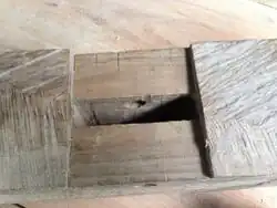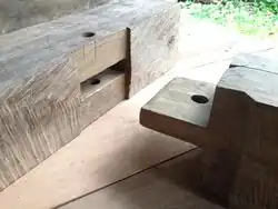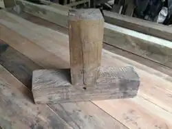 | This is the tenon piece. The tenon is inserted into the mortise. The part that fits into the mortise has a smaller width than the rest of the timber, because of the square rule (described above table). Only two sides of the timber are square, but the four sides of the tenon are made square by slightly reducing its size. A flat notch is made in the mortise piece (shown below) that is just big enough to fit the tenon piece. | |