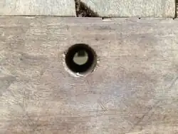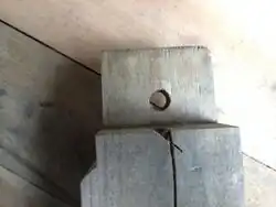 | A hole is drilled into the tenon that will be slightly above the holes drilled into the mortise by about 1/8". Holes are also drilled into the mortise. The holes should be about 1/8" below the tenon hole. This 1/8" offset is to ensure that when the peg is hammered into the holes the mortise and tenon pieces are pulled together by the peg. If they were offset in the opposite direction than the weight of the structure would rest on the peg rather than the frames, which would make it a very fragile joining. |