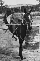 A mule team, like a team of horses, will run away, but usually it is out of orneriness. When they do run away, they won't hurt themselves. When horses run away, they run from fright and for dear life. Sometimes they won't quit until they tear all the harnesses off and will keep on running even into a fence or something solid, often hurting themselves. A mule won't. He will stop first. Waldo Davis once had a team of mules hitched with a saddle mare who ran away. "They run for over a mile, hung up down there in the river bottom in the fence. One mule out run the others and circled them around and run them into the fence, hung them up. Well, we was quite a little while getting down there. Them mules was a-standing still as they could and this mare was a-kicking and pulling and trying to get loose. The mules was just standing there still as a cat stood. Now that's just the difference between a mule and a horse."