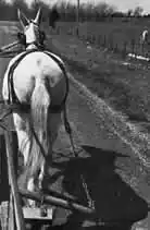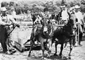 The first step in breaking a mule is to know at least a little more than the mule. They are started as two year olds before they get too strong. Most people start by teaming the young mule with a broken mule or horse first. Waldo Davis who has broken over 300 mules and handled over 2000 says to break a mule, "You just catch them and tie them up and put the harness on them. Hook them by one that's broken and push it around to your plow. Get it still enough to get it hooked and get behind it and start out a-working till you wear it down. The broke one has to kind of handle it, though. When you say, 'Whoa,' the broke stock will tell the other one he has to stop. You just work them till you wear them down. Some of them last all day and some of them don't last over a half a day. You work them till they are pretty tired, till you can't get them to go as a rule. Just as a rule when they get about two-thirds of the way tired, they'll stop. When ever they get tired that-a-way, pull the lines to work them bits. You can say 'Whoa' and get them stopped.