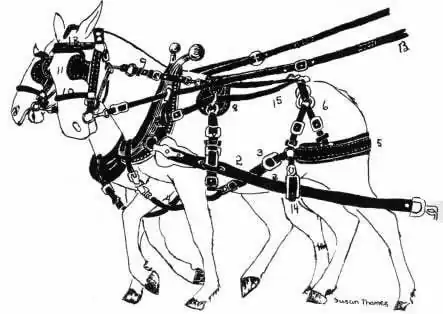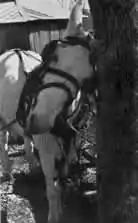 The last mules Waldo broke, he used a harness he called a "W." The "W" teaches young mules what "Whoa" means about the third time he hears it, usually in about five minutes. To hook up a "W" harness the young mule. Put a leather strap around each front ankle with a steel ring fastened to the strap on the inside of each foot. Run the rope on down the inside of the front leg, through the ring on the ankle, back up to a ring where the pole strap joins the collar, down to the ring on the other ankle and back up to the ring on the hames on the other side. The two ends of the rope go back to the driver and are held like lines.