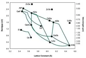 In monolithic MJ devices, each semiconductor layer is grown on top of one another. However, if the lattice constants of the crystals in adjacent layers do not match this will result in lattice strain and potentially dislocations. These dislocations cause defects to form in the crystal structure leading to unwanted recombinations and subsequently a decrease in cell efficiency. For this reason, it is advantageous to select semiconductor materials that have matching or closely similar lattice constants. Figure 5 shows a list of common MJ semiconductors and their lattice constants. The turquoise lines indicate the lattice constants for mixtures of the two connected materials.