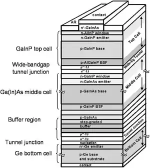 Figure 3 shows the detailed structure of a GaInP (1.8 eV) / GaInAs (1.4 eV) / Ge (0.67 eV) triple-junction solar cell. In this design a wide band gap (transparent) window layer is used to lower a cell's series resistance. It does so by enhancing the lateral flow of photogenerated electrons trying to reach an electrical contact or tunnel junction (see Tunnel Junctions). A buffer layer is also used between the bottom and middle layers to reduce lattice mismatch effects (see Lattice Constant Matching).