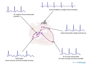 The "SVT" treated with cardioversion, adenosine, and vagal maneuvers in the prehospital and hospital setting is actually two separate cardiac rhythms that are very similar. These rhythms are known as AV re-entry tachycardia (AVRT) and AV nodal re-entry tachycardia (AVNRT); a graphical representation of these rhythms can be found in Figure 1. In both rhythms, conduction takes place in a circular motion (i.e. re-entrant motion) that allows for a faster rhythm than the SA node would normally allow; because the myocytes will depolarize and be refractory to further stimulus, the SA node may not be able to take over without external assistance. In AVRT, there is an accessory path between the and ventricles (remember the Bundle of Kent from (Wolff-Parkinson-White syndrome) that allows for a circuit of electricity to bypass normal conduction. AVNRT is simply a circuit of electricity caught within the AV node its fast and slow pathways that propagates a ventricular response with every cycle. It is not required for paramedic students to be able to differentiate between AVRT and AVNRT, but it is helpful to know they exist, as the accessory pathway that is always present with AVRT is responsible for the danger of using adenosine for "SVT" with concurrent atrial fibrillation history.