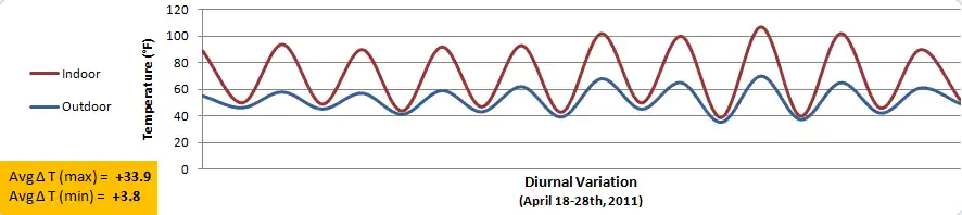 Maximum and minimum temperatures over a 10-day period, including cloudy and sunny conditions. The objective to raise the daily maximum temperature was clearly met. The addition of plants and compost and the resulting increase in interior thermal mass should increase the daily minimum as well, once those elements are incorporated.
