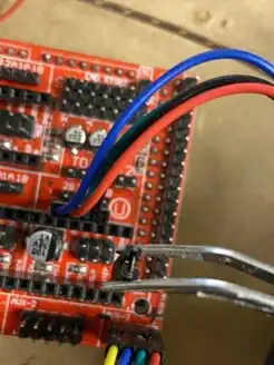Each stepper motor should be wired to to the pins next to the axis letters X, Y, or Z. Under it, you should place jumpers to set the step size (currently we put one jumper for each motor, placed on the right, setting a step size of 1/16). On top of the jumpers, should place the stepper motor driver. The little screw on the drivers sets the current. (Jumper is shown in tweezers)