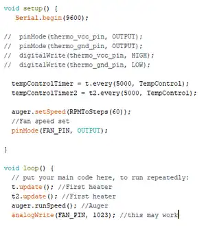 //set ramps 12v pin const int HEATER_RELAY_PIN = 9; //this goes in the setup function //setup heater pin pinMode(HEATER_RELAY_PIN, OUTPUT); digitalWrite(HEATER_RELAY_PIN, LOW);