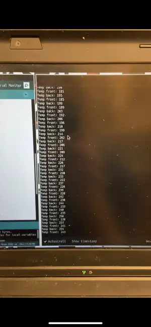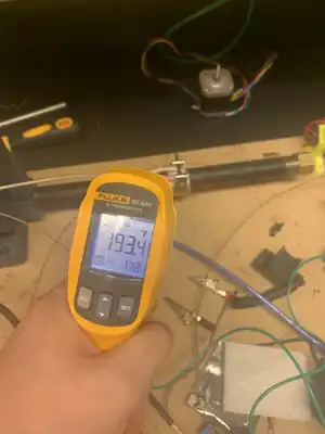 Spring of 2020 was focused on finalizing our first design and assembling it with the goal of having basic functionality by the end of the semester. Obviously the campus shutting down due to COVID-19 greatly affected our ability to accomplish that final goal but we still made good progress. As of the end of our ability to work in person, assembly of the entire hot end of the machine's mechanical and electrical elements was almost complete and we had begun verification testing of some basic functions. Our heaters were both able to turn on and we successfully regulated temperature using our Arduino code. For the stepper motors, we created test code and had started to test functionality when spring break started. Obviously we never got back into the lab to finish that verification work. Below is the current state of our build. Below is our current assembly(top) and our heaters running to a desired temp(bottom).