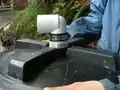 We transported the main storage tank from Resale Lumber in Eureka, CA and moved it from the truck to the correct position on the concrete slab. Next we assembled the various components that will connect the opening at the bottom of the main tank to a garden hose to access the stored water. To the top opening of the tank, we attached the rubber flexible coupler and a 90-degree PVC elbow to the coupler; these pieces connect to the PVC that runs from the first flush system to the main tank. The overflow tubing was attached to the main tank and a screen was attached to the end of the tubing to prevent unwanted guests from entering the tank.
