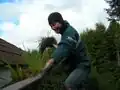 Before we could assemble the various components of the rainwater catchment system, we first had to wash off the roof and clean the gutters of the catchment surface as well as remove redwood tree limbs from above the roof (to prevent rodent access and reduce bird droppings from entering the system). Once this acrobatic feat was accomplished, we were able to lay out the various pieces of PVC piping and their respective connection pieces (eg. 45/90 degree elbows, quick disconnects, T-junction, etc.) and glue them into place.