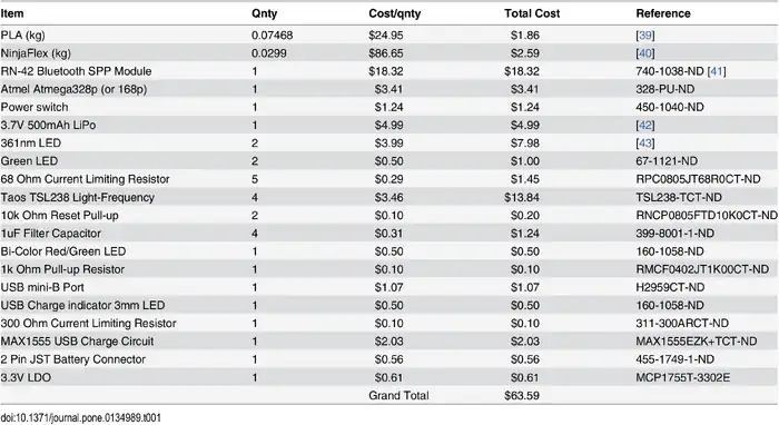 Cost breakdown of the photometer case and electronics (Digikey part # unless externally referenced).
