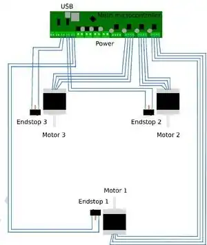 - Step motors and limit switches are wired to corresponding terminals on the microcontroller board, which is connected to Linux computer with a USB cable.
