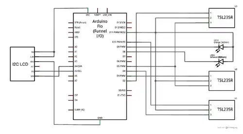 Connect the two LEDs, the LCD and the sensors to the Arduino Fio as shown in the schematic. Upload the firmware code to the Arduino and test whether everything is working correct. Important: to compile the firmware, you need the LcdMenu and DuplexFrequencyCounter libraries from another repository.