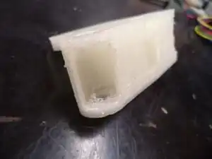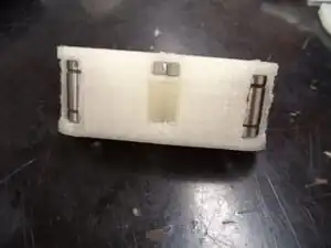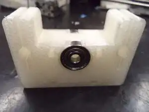 Linear bearings and nut inserted in the carriage.]] Snap the linear bearings into place on the hollowed out ends of the carriage. Then insert an M5 nut into the nut-trap on the bottom of the carriage.