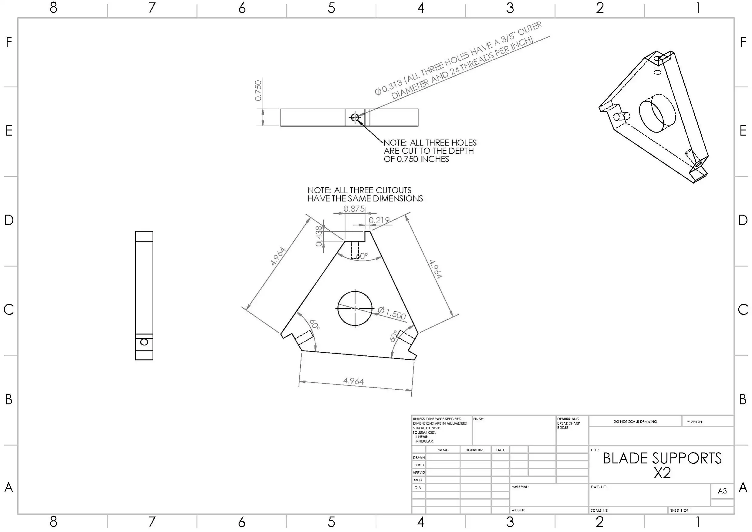 To mount the blades onto the blade mounts, two 3/4" long, 3/8" diameter bolts are needed to fasten each of the three blades.