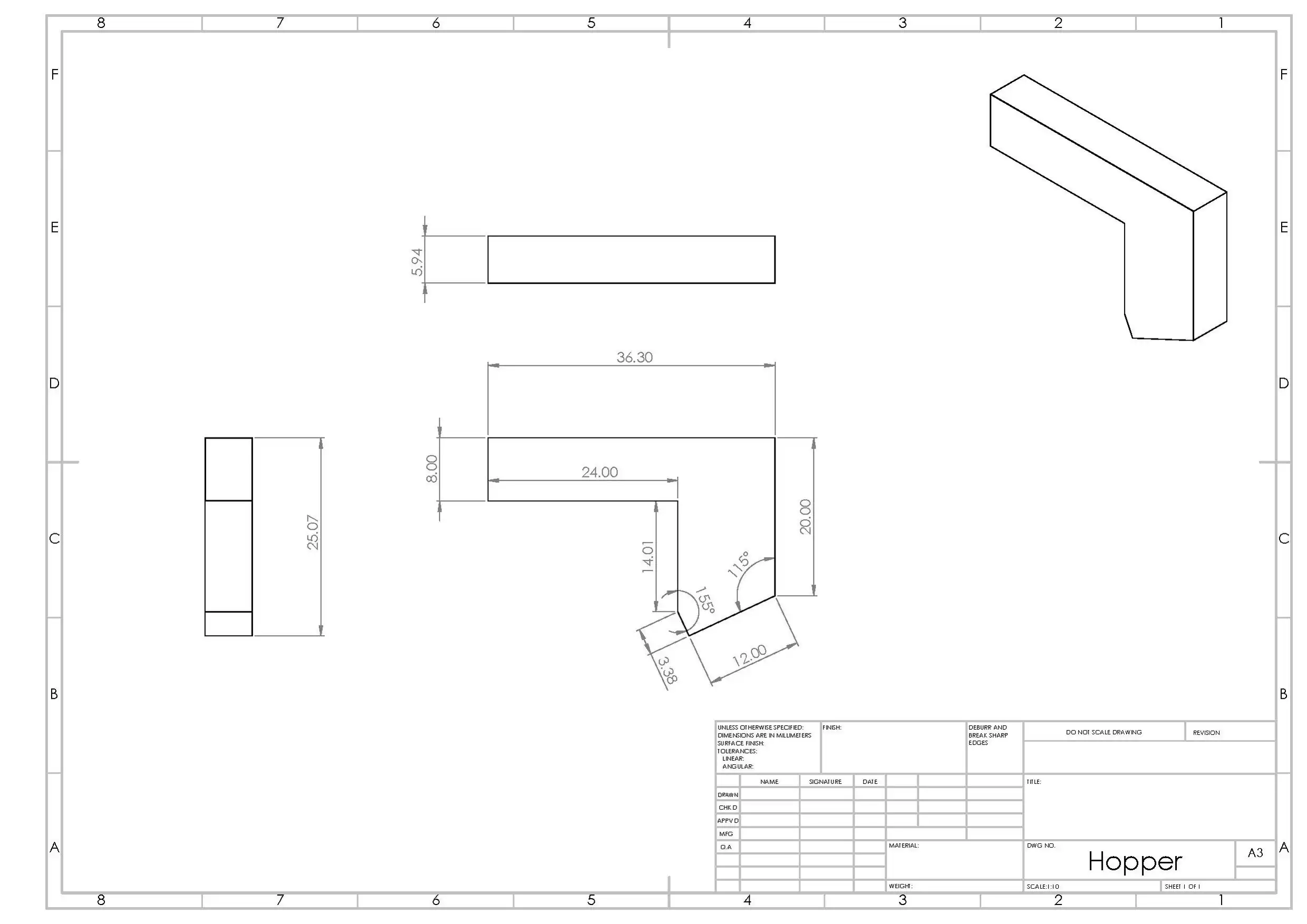 - To assemble the hopper the edges for each side need to be bent at a 90 degree angle. Once all of the parts are bent holes can be drilled on the tabs and the hopper can then be bolted together. The detailed drawing files for each side of the hopper and final assembly drawings can be found below: