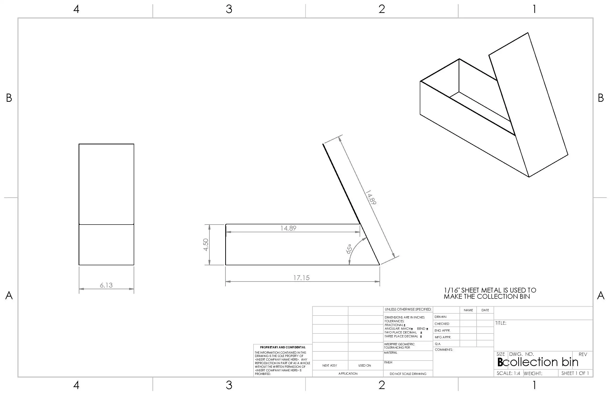 - The collection bin can be made by bending the tabs shown in the pdf file. Then holes are drilled in the tabs to fasten all four sides to each other. To seal the four corners, caulk, or HVAC tape can be used.