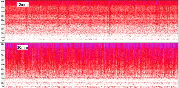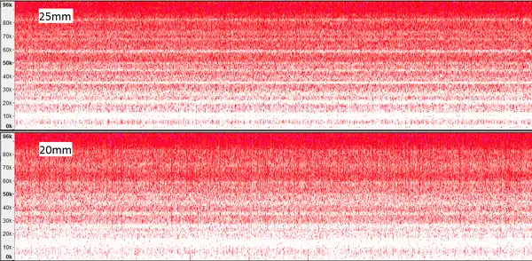 You might notice that the 20mm spectrum has more frequencies in higher ranges, but we want clearly defined bands to maximize the wolves' annoyance. Just by visual analysis you can tell that the bands in the 25mm whistle are the clearest and should, theoretically, have the most effect.