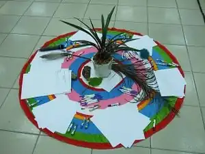 The "World Café" is a structured conversational process intended to facilitate open and intimate discussion, and link ideas within a larger group to access the "collective intelligence" or collective wisdom in the room. Participants move between a series of tables where they continue the discussion in response to a set of questions, which are predetermined and focused on the specific goals of each World Café. A café ambience is created in order to facilitate conversation and represent a third place. In some versions a "talking stick" may be used to make sure that all participants get a chance to speak. As well as speaking and listening, individuals are encouraged to write or doodle on a paper tablecloth so that when people change tables they can see what previous members have expressed in their own words and images. The first World Café event was organized in 1995 and since then the number of people who have participated in events is estimated to be in the tens of thousands.