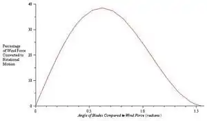 The angle is adjusted in radians and seems to indicate a maximum value at approximately 0.62 radians, or roughly 35.5 degrees. This translates in a maximum conversion of 38.5% of the wind force into rotational motion. Therefore, the blades should be tilted at an angle of roughly 35.5 degrees from the oncoming air stream to obtain the optimal amount of energy using flat blade windmills.