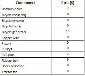 William has disclosed that his windmill cost approximately $15 to produce and that the bicycle generator was the most difficult to attain.[8] An estimate of the costs for the various components has been compiled based on what he has been able to find for free in the scrap yard or from family.