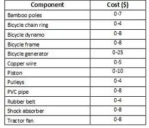 In rural settings, the cost for the parts will vary significantly based on the materials that can be salvaged or must be purchased either locally or from neighbouring villages. Therefore, it is more appropriate to offer a range of anticipated costs based on the variability of how accessible certain materials are. While this is purely an estimate, it offers an idea as to how much one might expect to pay for the parts.